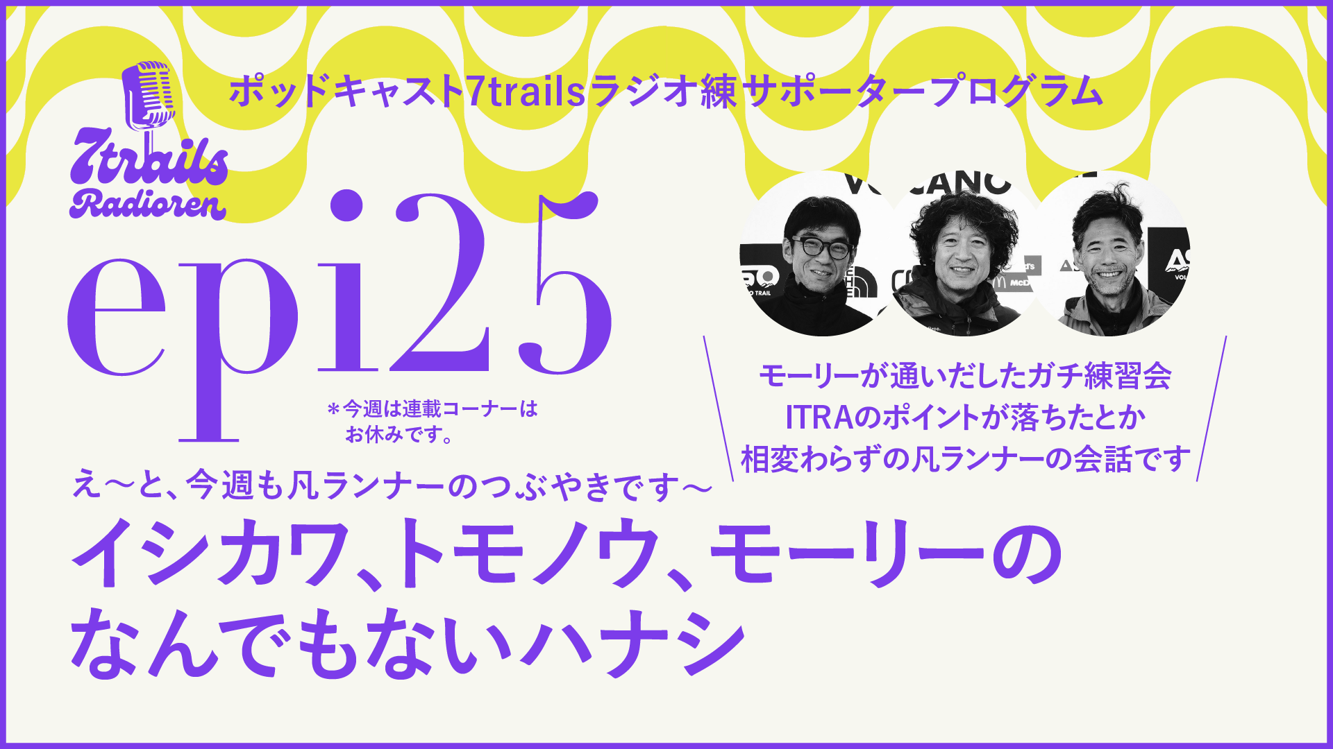 今週のサポーターズエピソードは、イシカワ、トモノウ、モーリーによる「なんでもないハナシ」。メインの話題は、モーリーがついに大濠公園で有名なガチ練習会「船津教室」に通い出したというニュース。モーリーのやる気がとにかくすごいです(笑)。そのほか、グループランに現れた期待の新人「たまきち」の話や、凡ランナーが気にする小さな誇り「ITRAのパフォーマンスインデックス」についてのぼやき、さらには11月開催予定の「球磨川リバイバルトレイル」川辺川コースについての展望など、内容は盛りだくさん。走る前まではなんでも言える、そんな僕らの与太話をゆるっとお楽しみください。